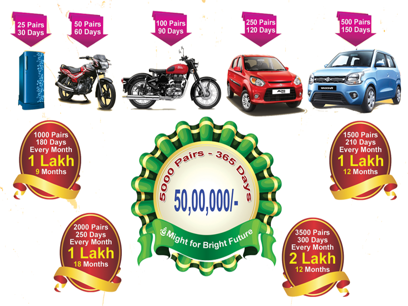 1:1 Rs. 600/- (Unlimited Depth) Associate will have to introducce two Associate on Both A and B side available benefit of Matching Power Weekly limit 100 Pairs (Rs. 60000/-).